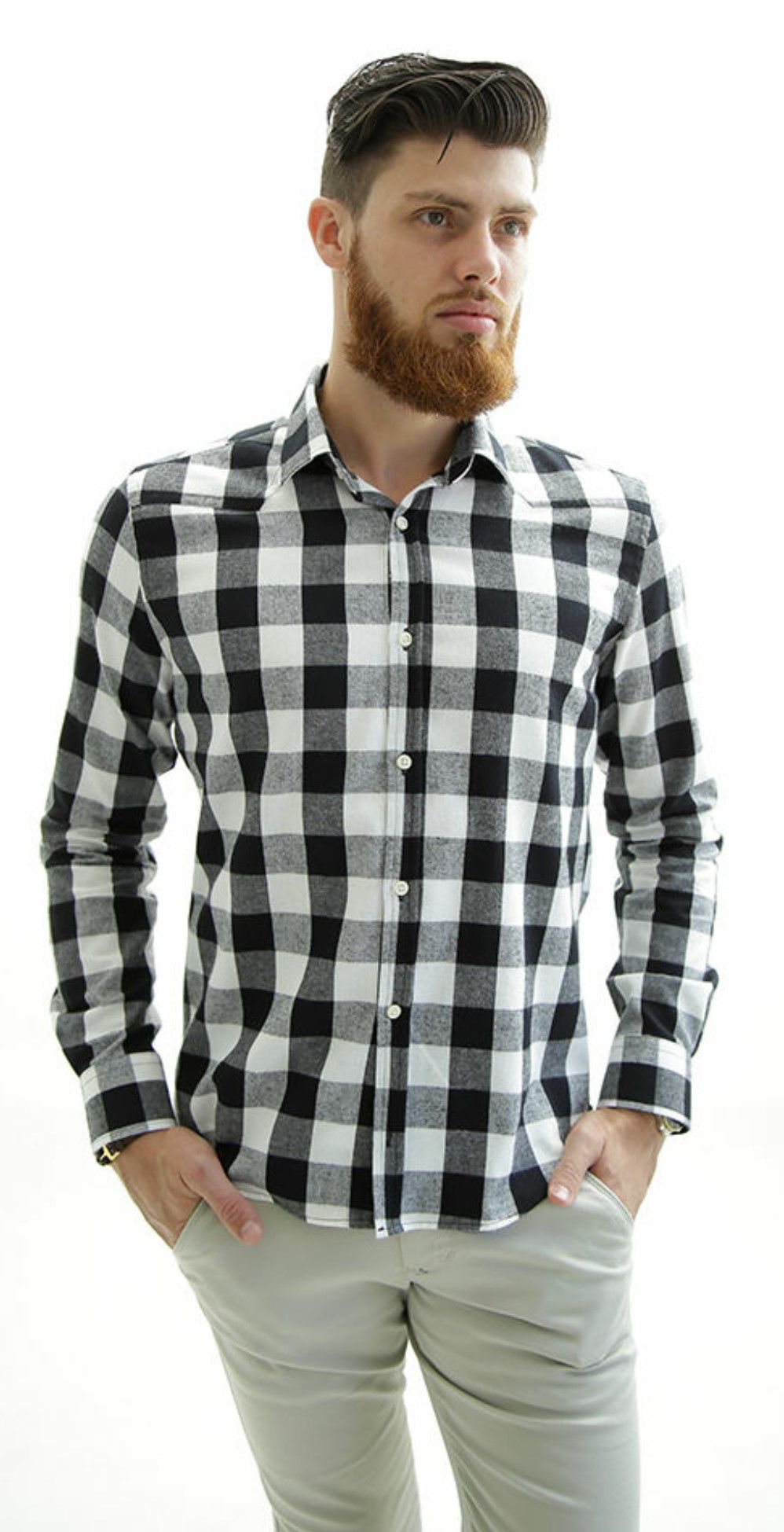 Camisa Masculina Slim Fit ML Flanelada Xadrez Branco Preto